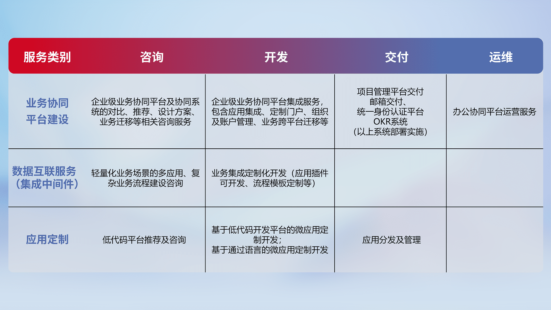 针对钉钉、、、、企微、、IDaas等平台级产品提供产品的规划、、、方案、、、交付、、定制化开发等服务,,实现如统一协同办公、、、、智能客户服务、、混合会议管理、、、智能数据查询、、、、等业务场景,,,,实现数字化转型。。