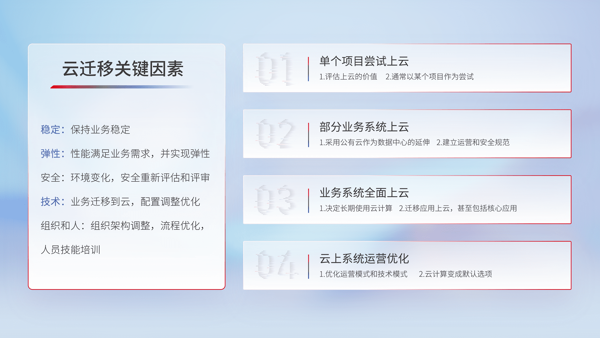 结合实际业务,,从规划设计、、云平台选型、、、云原生改造、、、、数据迁移、、集成交付,,迁移全过程为客户识别最佳上云路径,,做好风险识别管理,,设计网络架构、、、身份权限、、、安全审计合规、、、、操作审计、、、日志审计、、、、监控告警策略、、、、多站点容灾设计等,,对云上基础设施进行整体规划,,提升IT治理水平,,以满足弹性、、、高可用、、高性能的需求。。。。